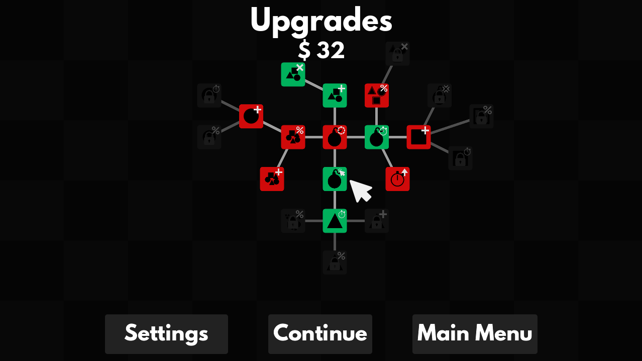 Controls - Left mouse button to place bombs and drag. Middle mouse button to zoom(on the upgrade hub)